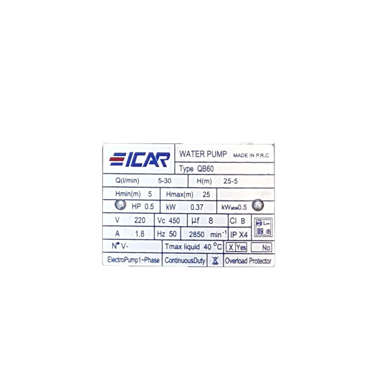 پمپ آب نیم اسب ایکار دستاورد کشور چین است که دارای پروانه از جنس برنج است و شفت استیل و بدنه چدن و سیم پیچی مس است و تک فار است این پمپ دارای دفترچه راهنما است